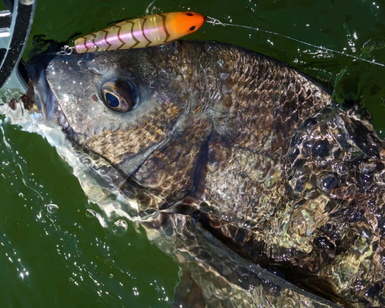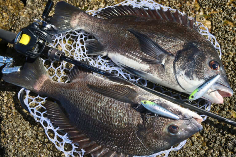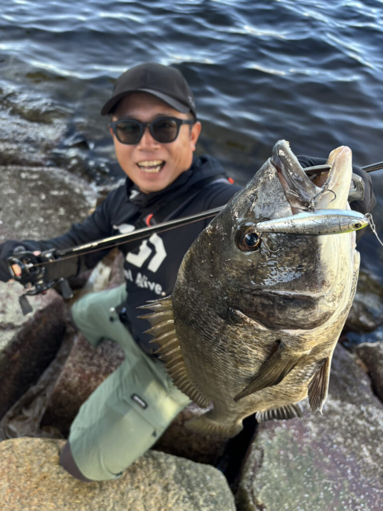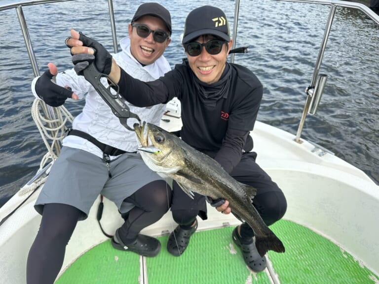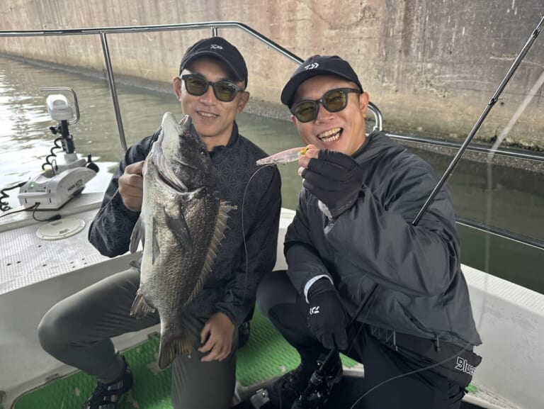 午前中、ラフトリック90Fで1枚キャッチしてもらうも、誤爆やバラシで追加ならず。「鬼畜ガイド」の文字が頭をよぎりましたが……午後から風表勝負に切り替えると、これが大当たり! 友人も黒鯛ツ抜け&ダブルヒット! ガイド大成功! 自分も年無し含む16枚ほど。ラフトリック70F“チャートヘッドアデルイワシ”無双でした。