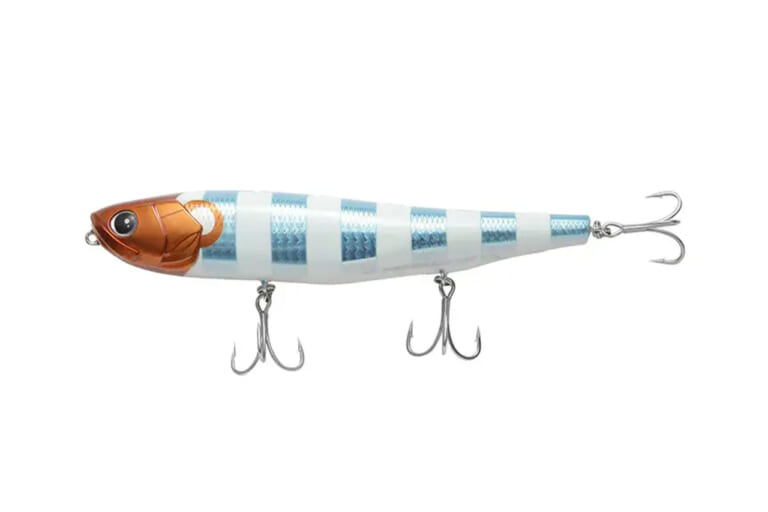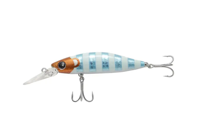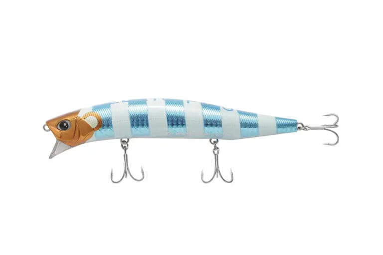 カラー名は「ベアーヘッドピケストライプ」。お腹にケイムラ&ラメを配し、ブルーのストライブ部にはホログラム、ホワイトにはグロー塗装を施した贅沢な本格仕様。見た目だけでなく、実釣性能にもこだわったカラーだ。