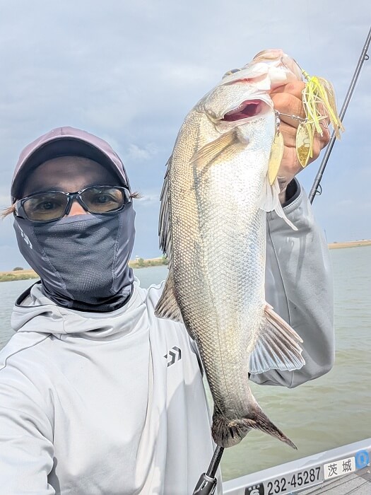 「今がチャンス!」とすぐに再開し、ブレーデッドジグ(ブレードジグ3/8oz+ヴァラップスイマー)で護岸の中層を巻きます。そしてすぐにガツン!と引ったくったのは、太ったグッドサイズ!