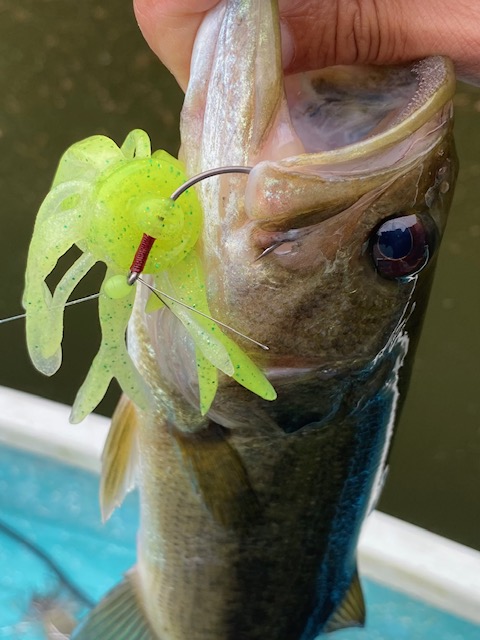 2日目、フリーキングは一旦封印してビッグベイトやスイムベイトで本湖方面を流しますが…バイトどころかチェイスすらなし。フリーキングに戻して、枝振りのよい立ち木や大きいレイダウンを探るとバイトがあります。やはり2メートル前後ですね。結局、可愛いサイズを5尾キャッチして終了・・・。
