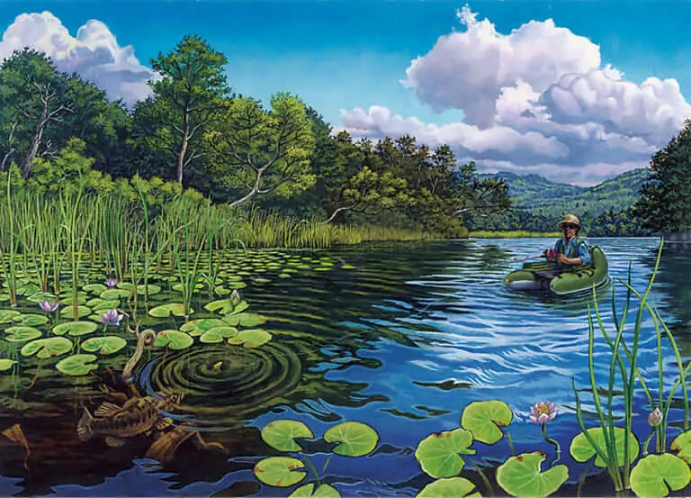 アメリカのワイルドアートと呼ばれる雄大な自然を描くスタイルと、日本のバス釣りが持つ情景が融和した八百板さんのイラストは、一目見ただけで彼の作品であることがわるほどにオリジナリティにあふれ、魅力に満ちている。