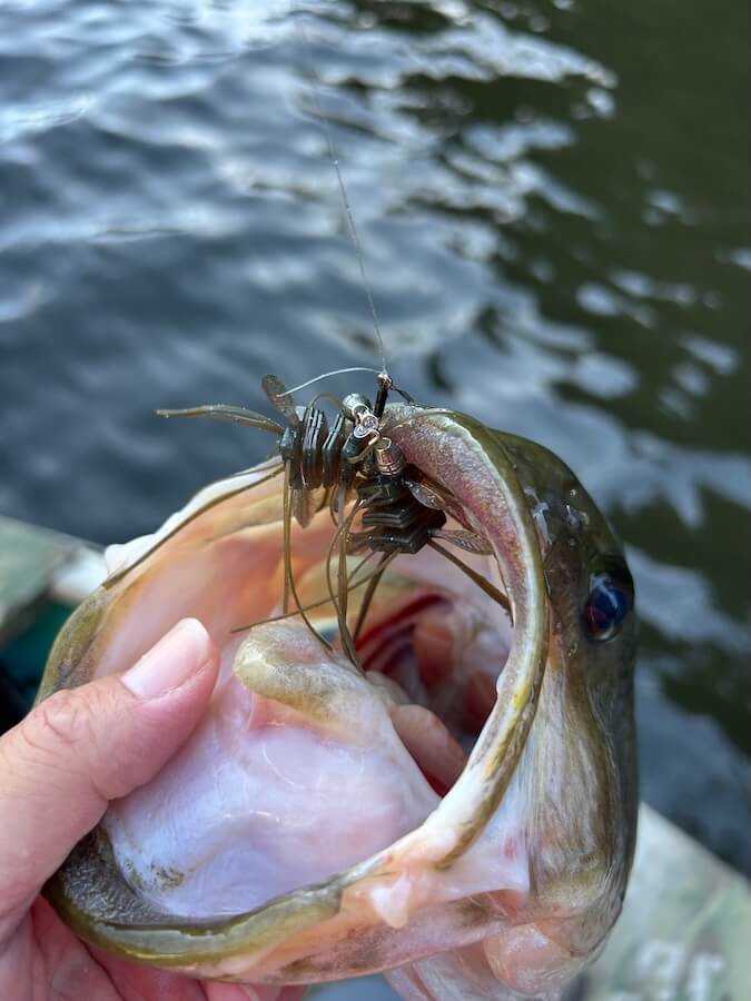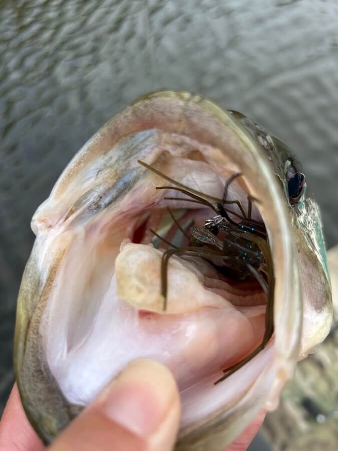 その後も立木や崩落を攻めていくも魚の状態はスロー気味。モリケンリグでも立木や馬の背をカーブフォール気味にシェイクしながら攻めていかないと食ってこないような状態でした。釣れると30後半〜45ないくらいでアベレージサイズは比較的良かったのですが、朝以外はデカイのどこいった〜状態が続いて1日が終わったような印象でしたね。