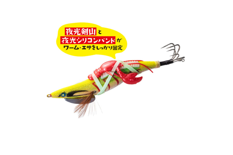 背中には、ワームやエサをしっかり固定できる夜光剣山を搭載。脂身やサンマだけでなく、クロー系ワームなど、さまざまな素材に対応。専用シリコンバンドで簡単にセットでき、ズレやすいエサもしっかりホールドする。