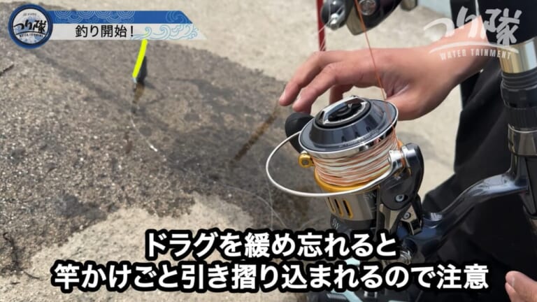 待ちの多いシンプルな釣りではあるが、不意にターゲットが掛かってしまうとタックルが引きずり込まれる恐れがある。そこで、引きずり込まれないようにドラグをズルズルに緩めることに。
