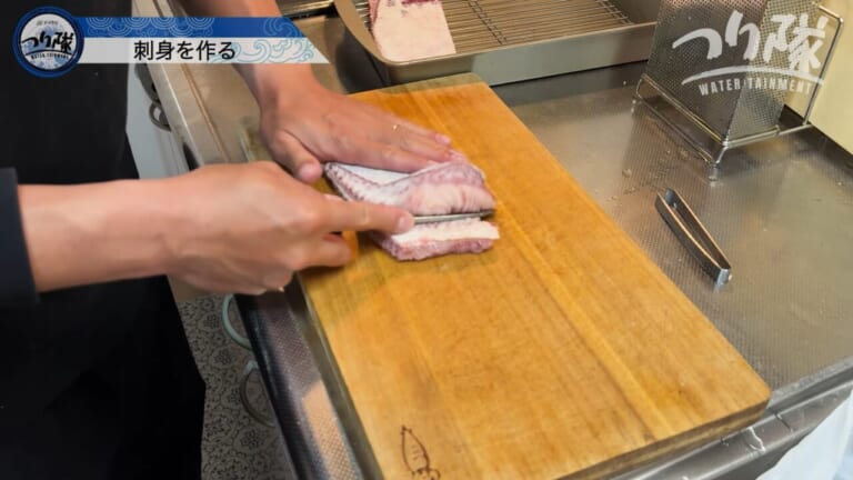 血抜きなどの処理をしたらキッチンでいざ調理開始!今回作っていくのは、アカエイのお刺身とから揚げだ。