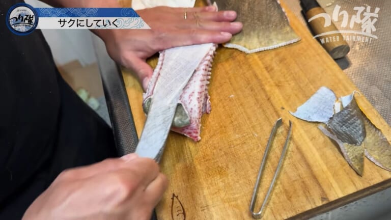 ここから3枚におろしていく。切り口はエンガワに近い感触らしい。まず、お刺身にするためにお湯で霜降りにした後、氷水で絞めて徹底的に臭みをとっていく。