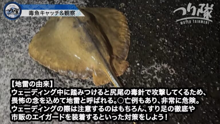 地雷といわれる由来は、釣り人がウェーディング中に誤って踏みつけてしまうと尻尾の毒針で攻撃してくるため。毎年必ず被害者が出ているほど、釣り人にとっては身近で非常に危険な存在だ。