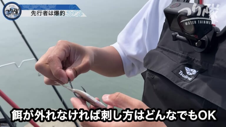 いよいよ実釣開始!エサは豆アジを縫い掛けしたもので、ブッコミ釣りで狙っていく。釣り方は、投げて底まで沈め、糸を張って待つだけ。