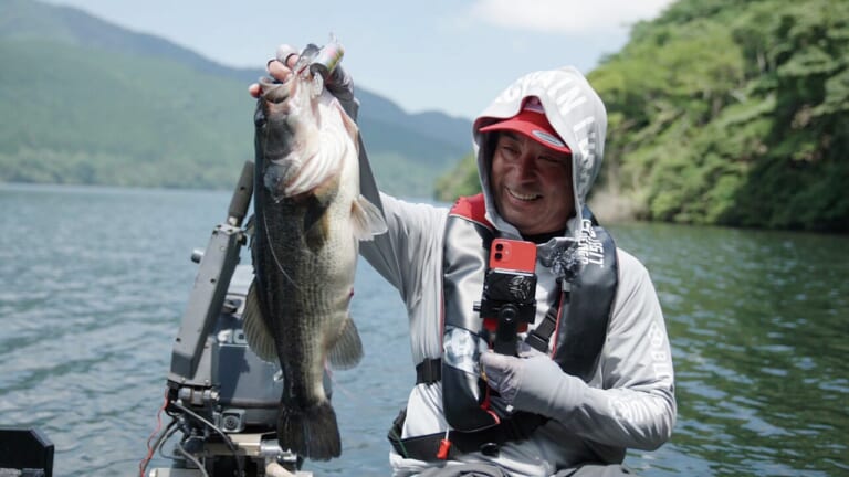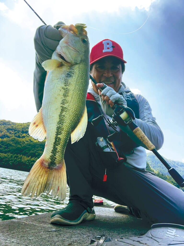 ベローズギルのネコリグでキャッチした相模湖の45センチオーバー。ラインはオーバーテックスの18ポンドを使用していた。「この18ポンドというのも、カバー撃ちに使える絶妙な太さで気に入っていますね」。