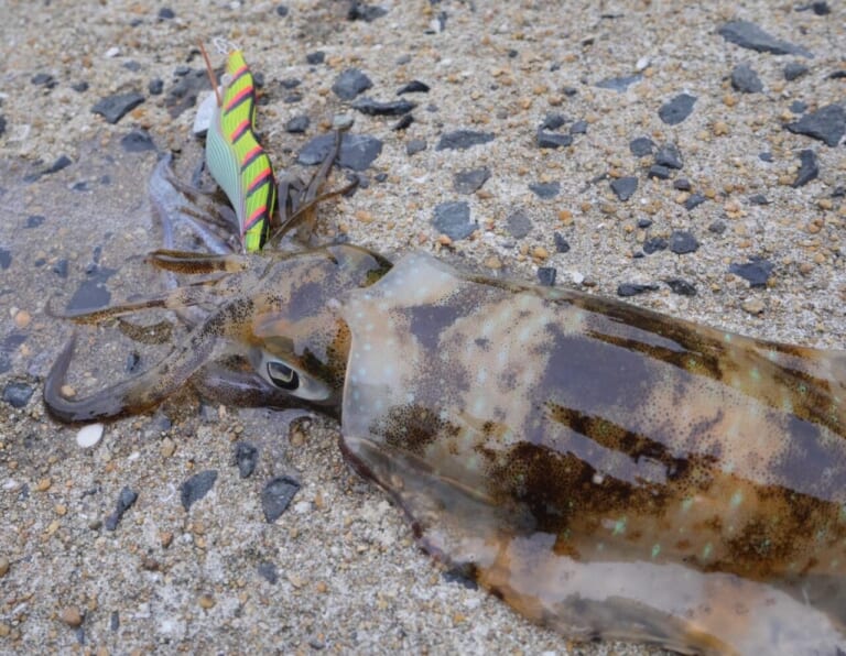 秋は波止や岸壁、磯、サーフなど、いろんなポイントで手軽に狙うことができる。なお、イカスミで波止が汚れてしまった際はきれいに洗い流しておこう。