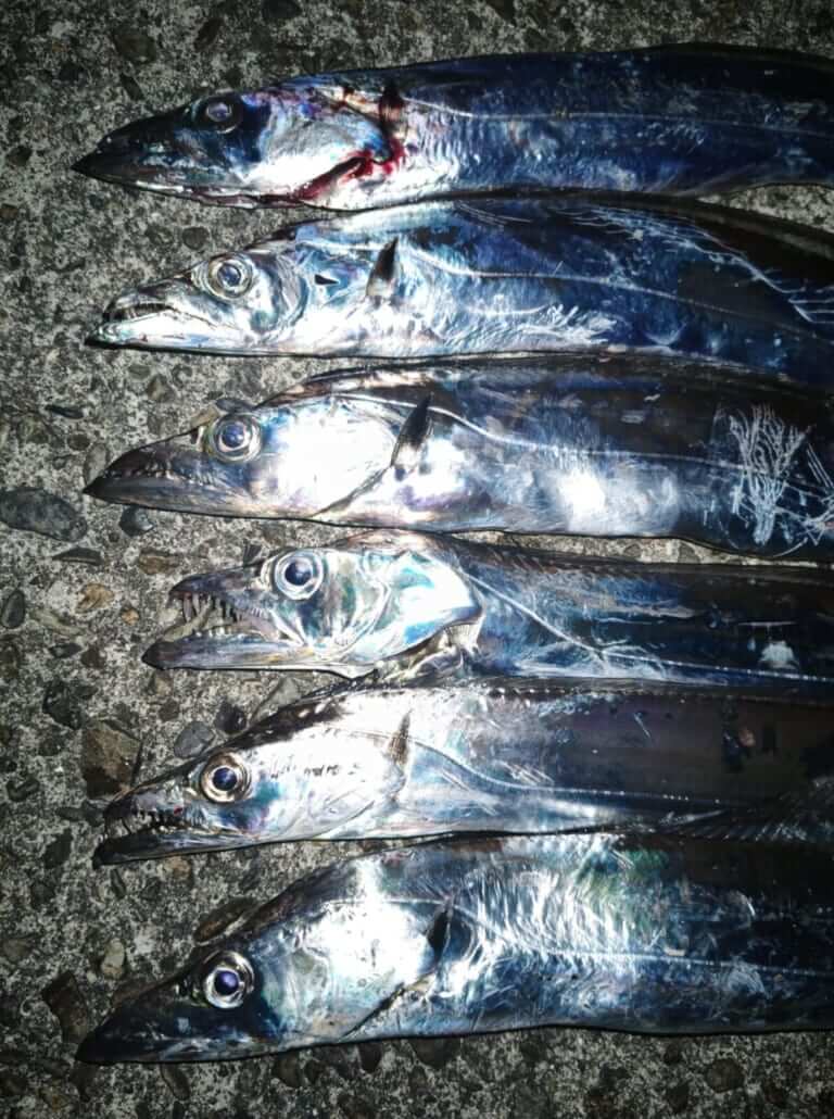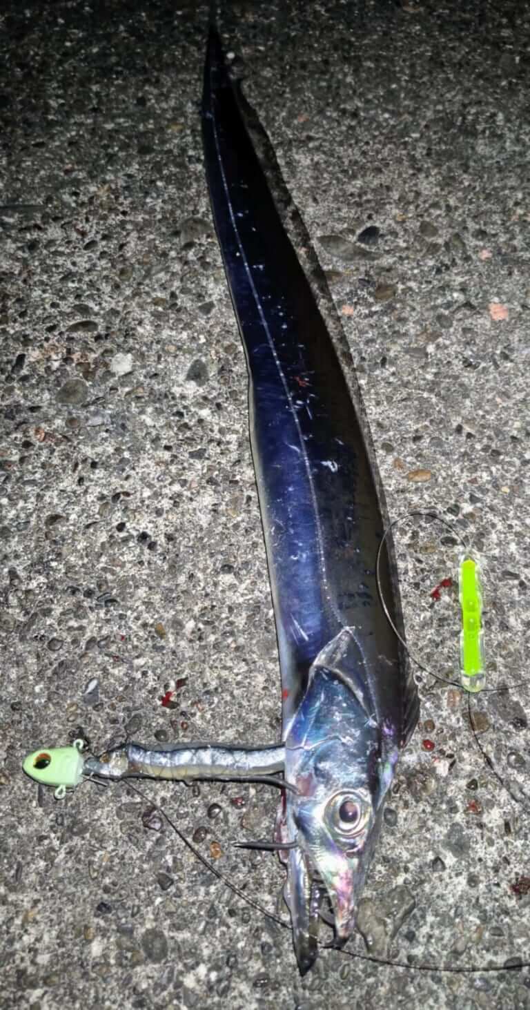 年回りによって釣果は大きく変わるものの、10~12月にかけては夜釣りでタチウオを狙うことができる。身幅が指3本前後がアベレージサイズだが、まれに4本や5本クラスの良型もヒットする。釣り方はテンヤを使った引き釣りやウキ釣り、サグリ釣りで、エサは冷凍のキビナゴやイワシ、サヨリなどを使う。タチウオが狙えるポイントは混雑しがちなので、マナーを守って釣りを楽しみたい。