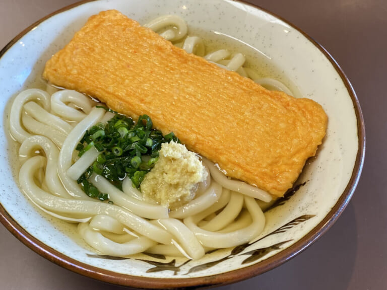 香川の名店「山地蒲鉾」のえび天がどんと乗った「やまぢのえび天うどん(490円)」は思わずリピートしたくなる旨さ。