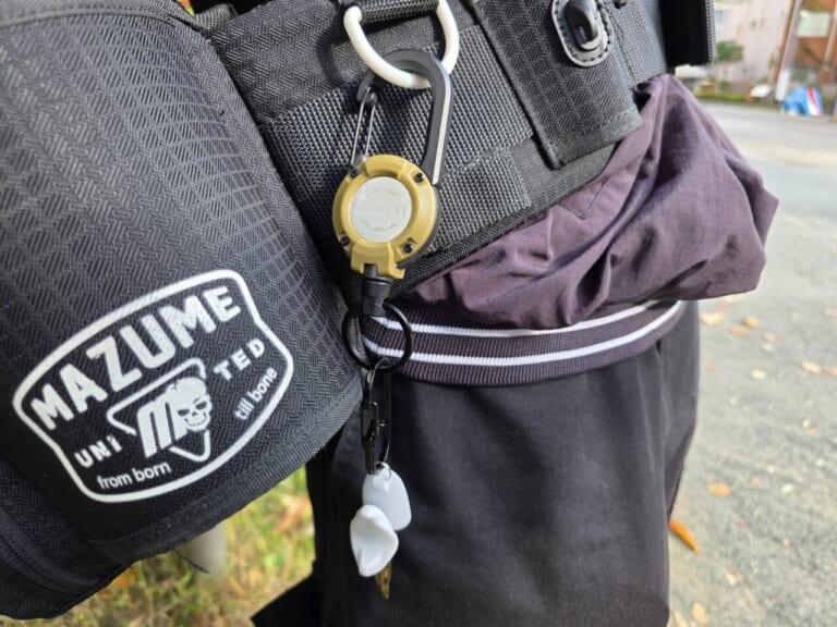 ピンオンリールといえば安全ピンタイプもあるが、ぶら下げたアイテムを引っ張って使うという性質上、カラビナタイプのほうが負荷に強いので適していると考えている。