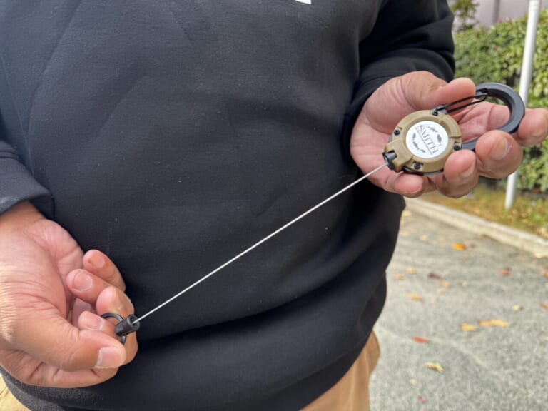 なんとカラビナリールグランデは「スチールワイヤー」を使用している。多くのピンオンリールはナイロン製で、使っているとやがて擦れて切れてしまうが、スチールワイヤーならかなりの耐久性が期待できるだろう。