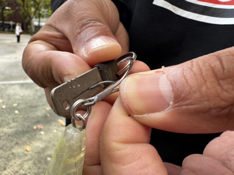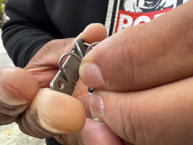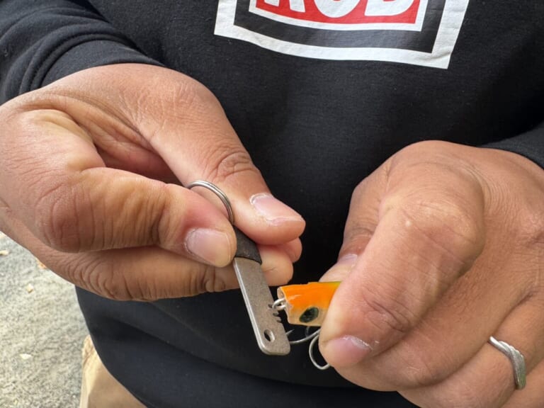 さらにはフックに引っ掛けてルアーを引っ張り、ラインを締めこむためのホールも設けられている。