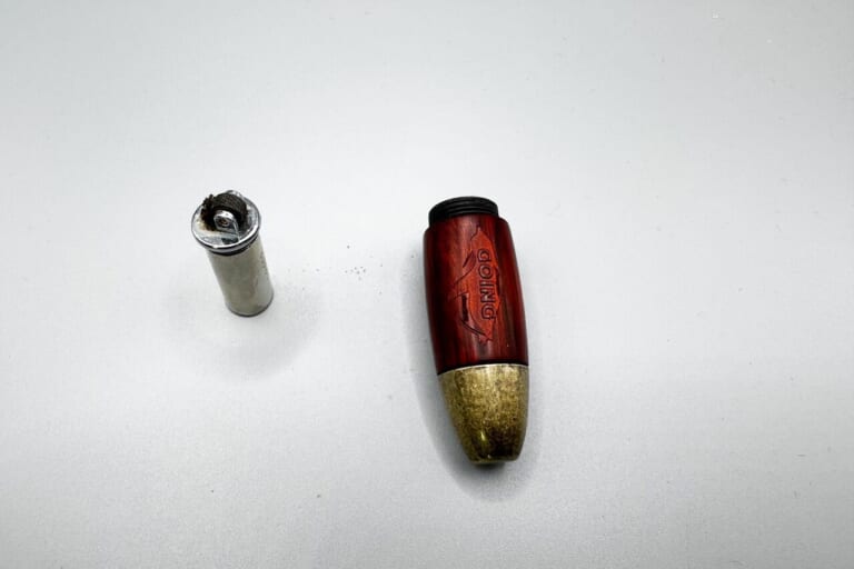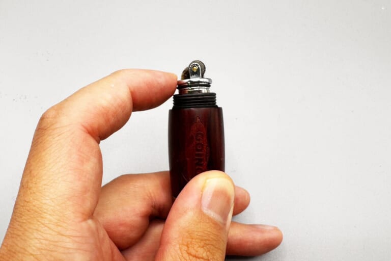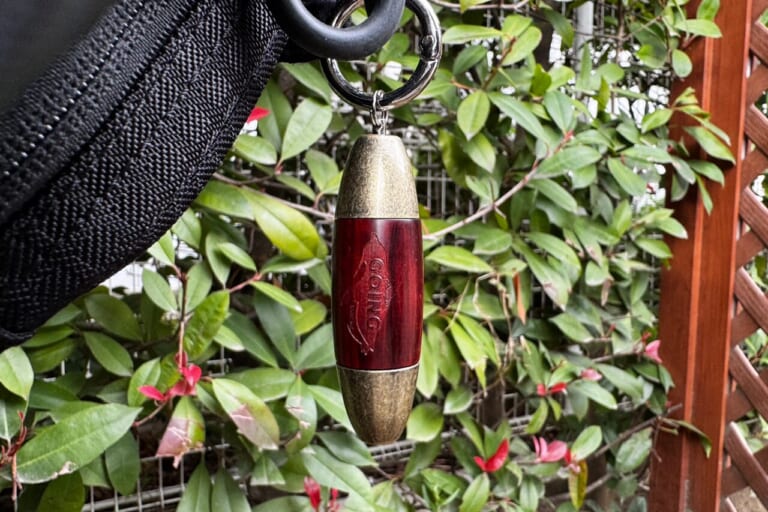 購入した価格は2千円ほど。本体部は真鍮と手触りのいいウッド(編集部調べ)になっており、センター部にはペンギンライターの刻印がされている。蓋には最初からカラビナが付いているので、バッグやズボンにぶら下げて持ち運べる。
