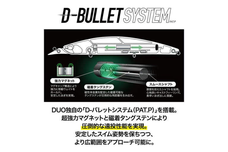 注目ポイントとして、DUO独自の「D-バレットシステム」を搭載。強力なマグネットと磁着タングステンによるウェイト移動システムが、抜群の飛距離を実現。向かい風や横風のシチュエーションでも安定したキャスト性能を発揮し、広範囲のサーチが可能となった。