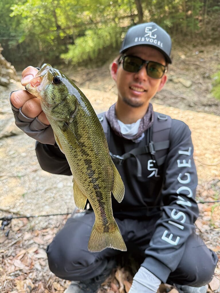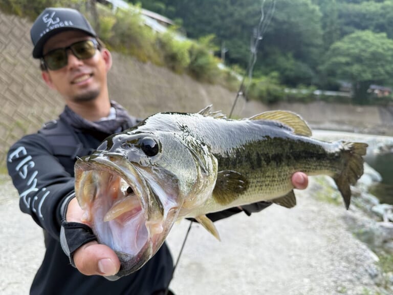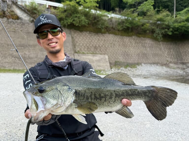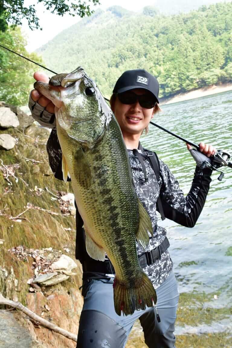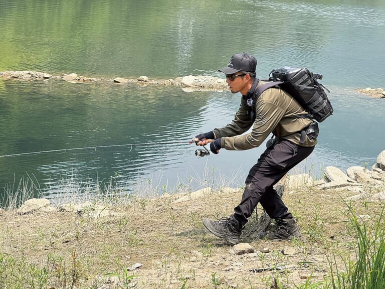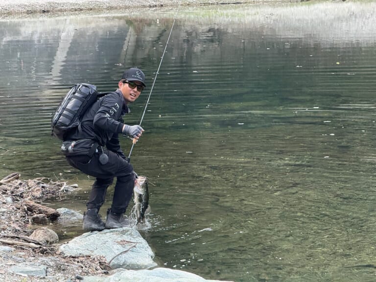 食わせに手こずっていた芝田さんだが、必釣パターンとして見出したのが岸際にワームを落とし白兵戦距離で誘って食わせるというテク。対岸ではなく自分がいる岸際の至近で食わせるというパターンが特に多かった。