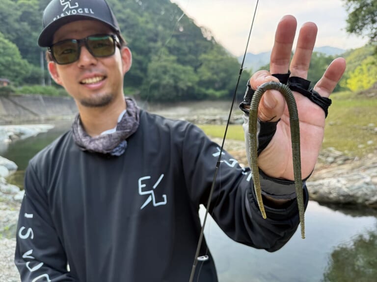 岸際に誘い込み、ロングワームで仕留める芝田さんだが、フッキングミスしやすいこの手のワームも技ありでフォロー。咥えてから軽いシェイクでより飲み込ませ、かなり食わせの間を与えてからフッキングにもちこんでいた。