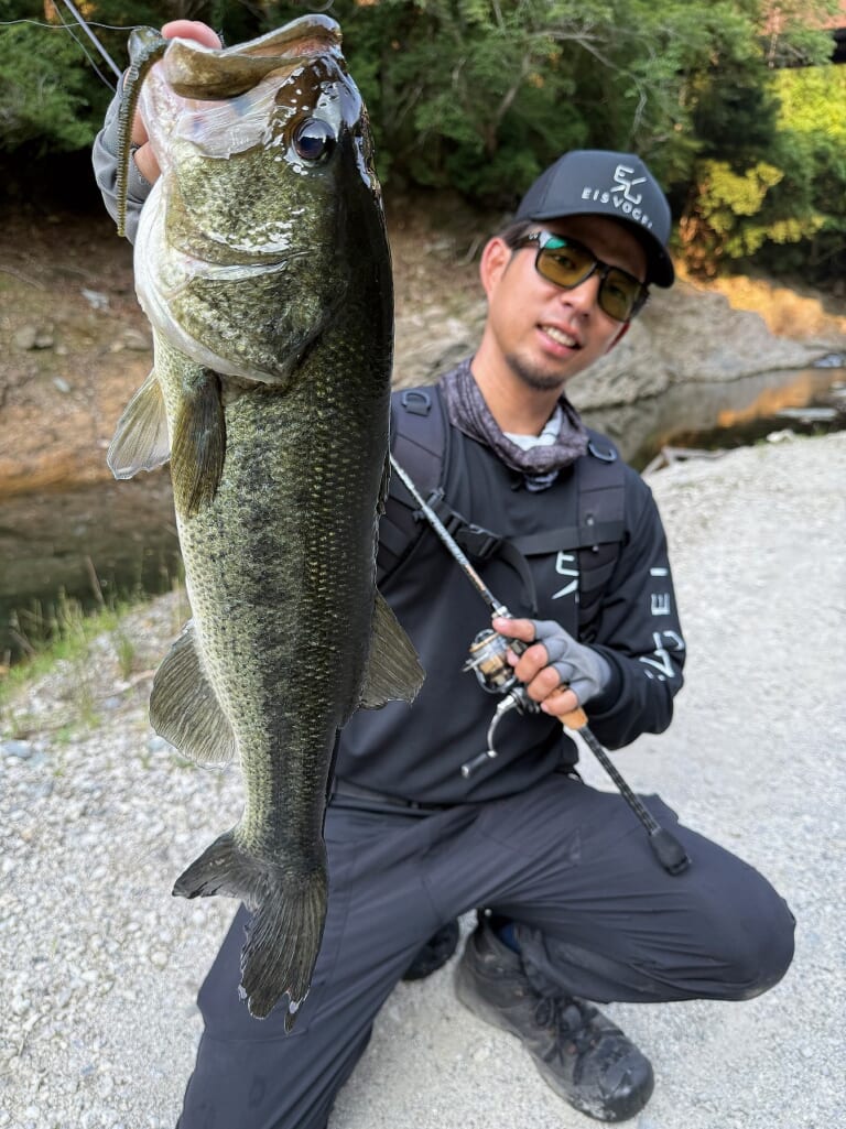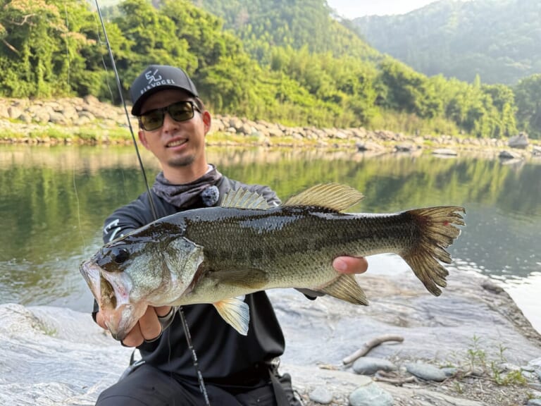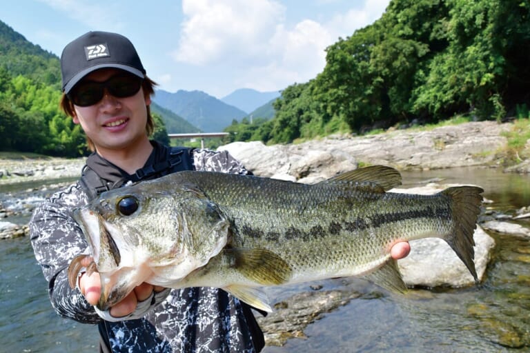 芝田さんがいたエリア最上流から下流に向かって戻る途中に仕留めたスキニーなビッグバス。遠目からアプローチして、フッキングとともに一気に駆け寄る。