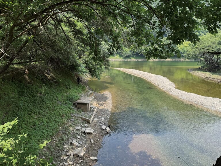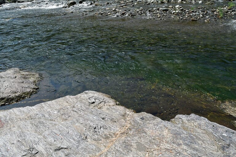 流れがヨレていて、さらに岩がえぐれてカバーになっている一級スポット。藤田さんは水辺からやや距離をとってルアーをキャスト。反転流に乗せて岩のえぐれにルアーを送り込みバイトさせた。