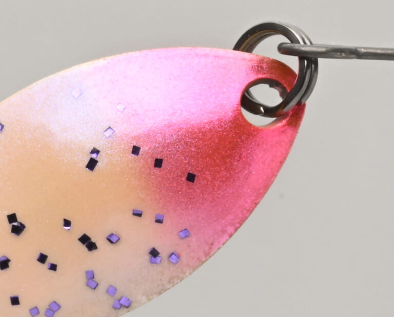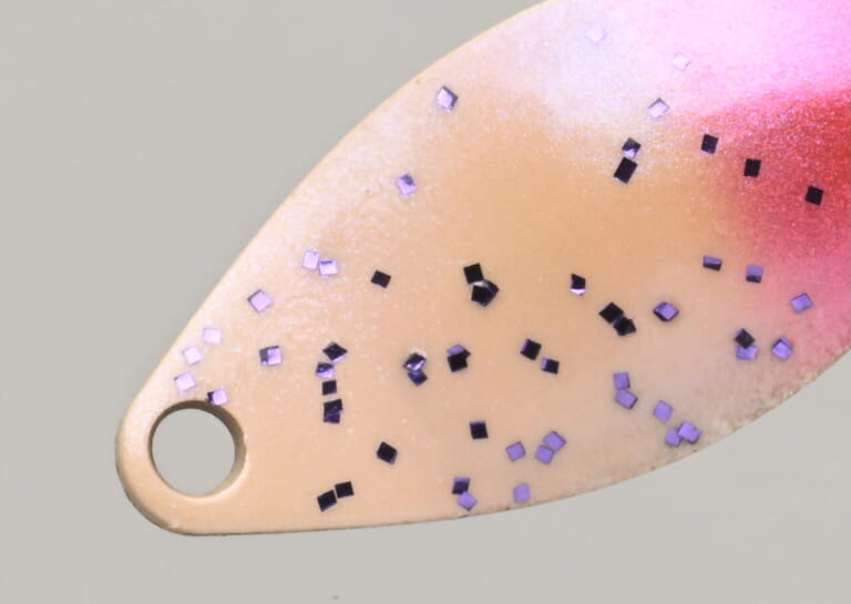 ヘッド側は膨張感を持つパールピンク。パールが入ることで遠くの魚が寄りやすく、視認しにくい水質でもスプーンを見失われにくい。さらにムラサキ系ラメを軽く散らし、視覚的な“釣れそう感”とルアーとしての美しさを両立した