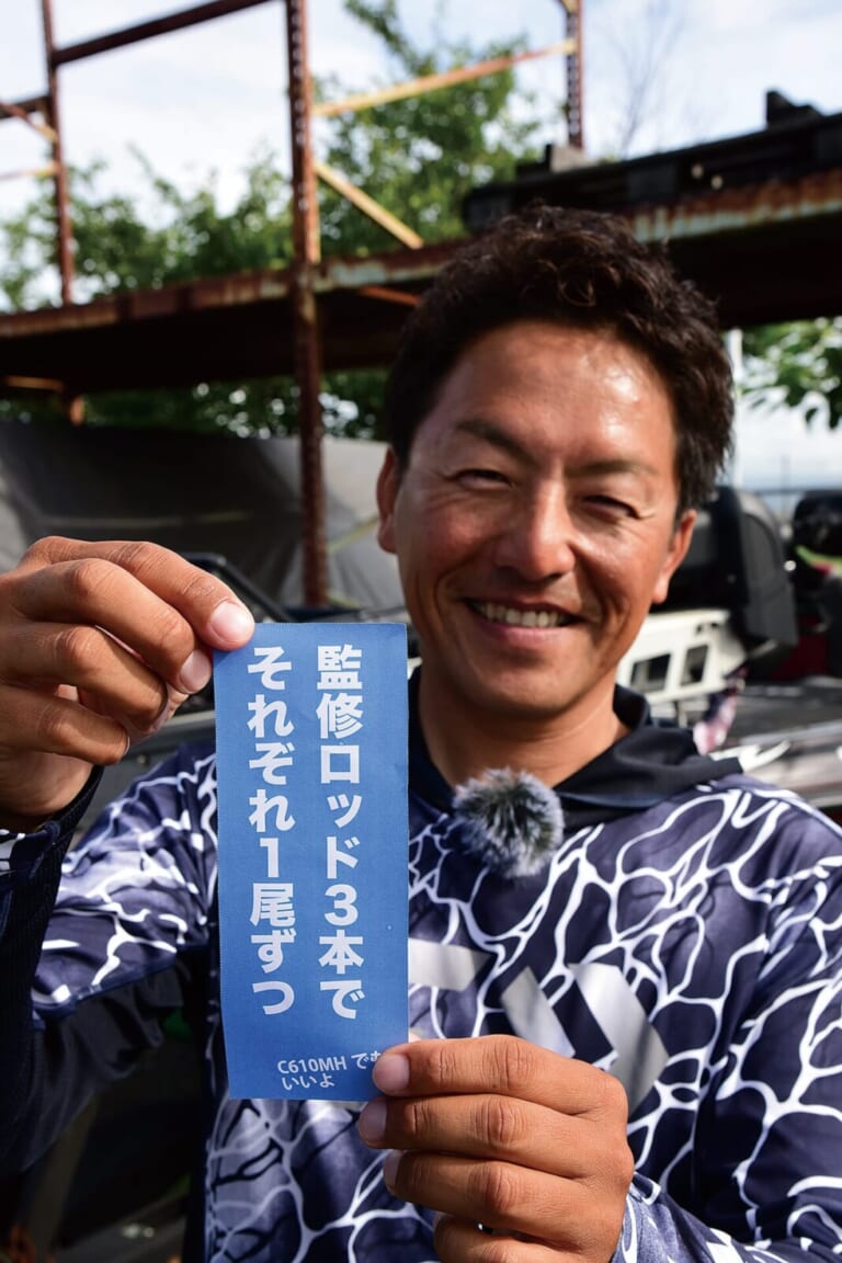 「ロクマル1尾」、「50アップ2尾」、「監修ロッド3本でそれぞれ1尾ずつ」という3つのお題から三宅さんが引き当てたのは…こちら。「ぶっちゃけ小バスを狙えば簡単なんですが(笑)。全部のお題をクリアするつもりでやりますよ!」