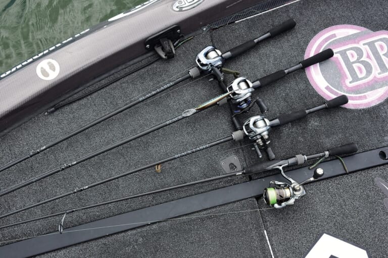 レンジャーを北へ飛ばし、最初にエレキを下ろしたのは北湖東岸にある小規模な浚渫跡エリア。選んだロッドはC73ML+、ルアーはスティーズミノー110FDRだ。