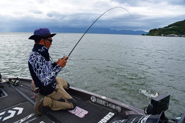 すると、すぐにヒット! 琵琶湖にしてはかわいいサイズだが、これで1本クリアした。