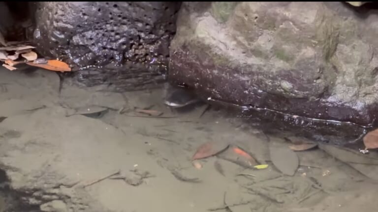 午前7時過ぎ、小川の岩陰をじっと観察していると、ウナギの頭がちらりと姿を見せた。