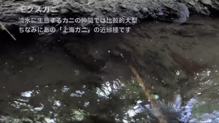 岩の間から現れたのは、大きいモクズガニ。さらに足を失ったウシガエルも。