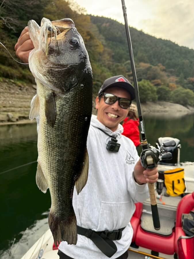 和田真至さんの早明浦ダム釣行。シャロードリームで一発を狙い、見事マックスサイズをキャッチ! 冬の船上で食べるカップラーメンは格別。これも釣りの楽しみの一つですね!