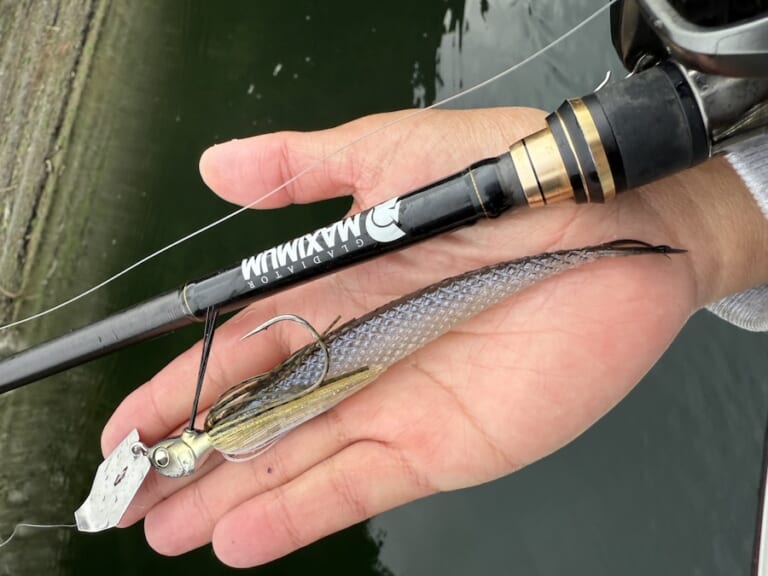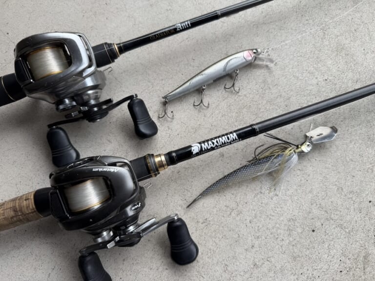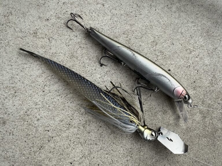 今回の早明浦ダムではジャークリッパーとマックスブレードタイプパワー(14g)+スーパーフィッシュローラー5inchを軸にシャロー展開で遊んでみました。