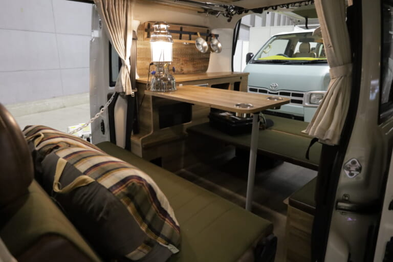 そして気になる室内空間。リアシートをソファのように仕立て、真ん中にテーブルを配置。まるでリビングのようなスペースに。