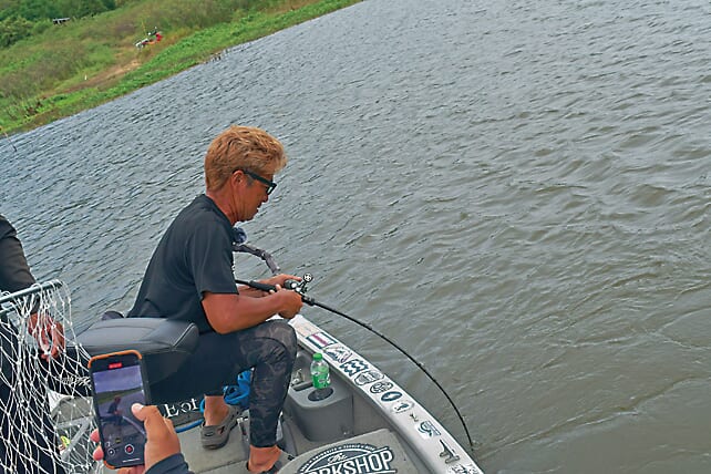 連日、チャドーを狙うルアーマンたちのボートで賑わい、中にはライブ魚探を搭載し、上下に設置された2画面と睨めっこしている釣り人の姿も。年3回、チャドーのトーナメントも開催されているという。釣れても、やり切って1日1~2本というのが奥田さんの見立てだ。しかも当然ながら、今回奥田さんが狙うのは自己記録更新のビッグチャドーだ。
