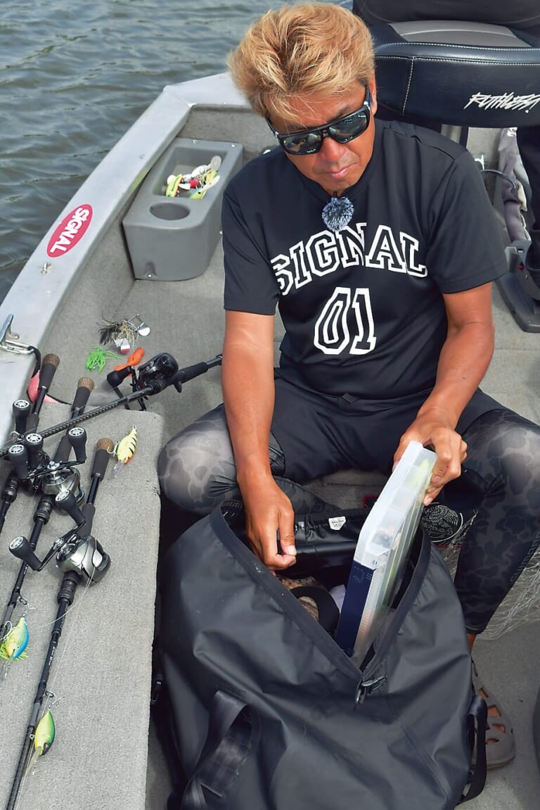 今や奥田さんの遠征に必携となっている防水バッグ『ドライロールアップダッフルL』(シマノ)。マルチピースロッドやリール、ルアーなど必要なもの全てをこのバッグひとつに収納していた。