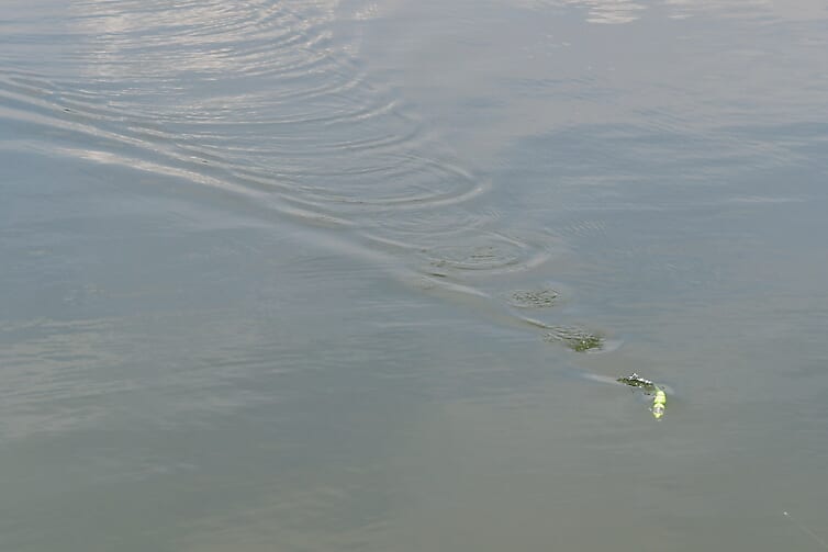 ライギョの仲間で肺呼吸をするチャドーはときおり水面まで上がってブレスをする。そういった生命反応をもとにガイドのジャックさんは大型のチャドーがいるエリアを見極めながら場所移動を繰り返していく。
