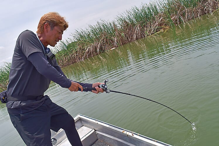 チャドーの狙い方は、シャッドテールがついたフロッグワームをスキッピングでカバー奥に入れて水面を引くスキッピングチャドーと呼ばれる釣り、バズベイト、そしてフライボールにつく成魚を狙う釣りが一般的だという。