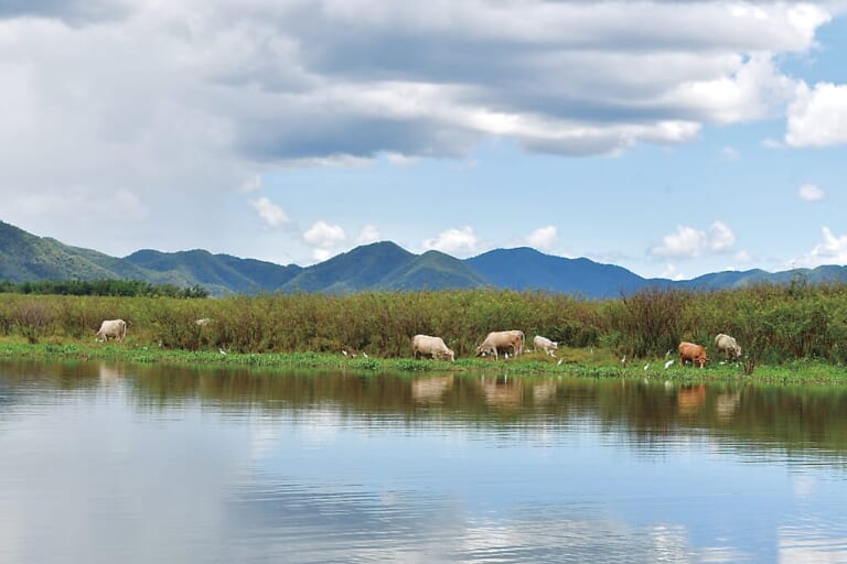 スロープと言ってもただの土の斜面だ。いかにも「秘境」と呼べる大自然の光景。水辺には草木が生い茂り、背の低い木々の間からはたくさんの牛が顔を出していた。しかし、そんな光景に惑わされ、手付かずの自然の中で魚を釣るのだと勘違いしてはいけない。