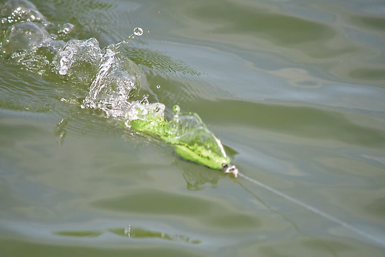 けたたましい音を立てて水面を走るフロッグワームに襲いかかったチャドー。激しく水面が割れるバイトは病みつきになること間違いなしだ