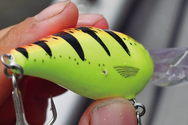 ときおりクランクベイトやミノーに『ドゥン!』という強烈なバイトを得るものの、フックアップにまで持ち込めない奥田さん。バルサ製のクランクベイトに空けられた深い穴が、もどかしさを増幅させる。