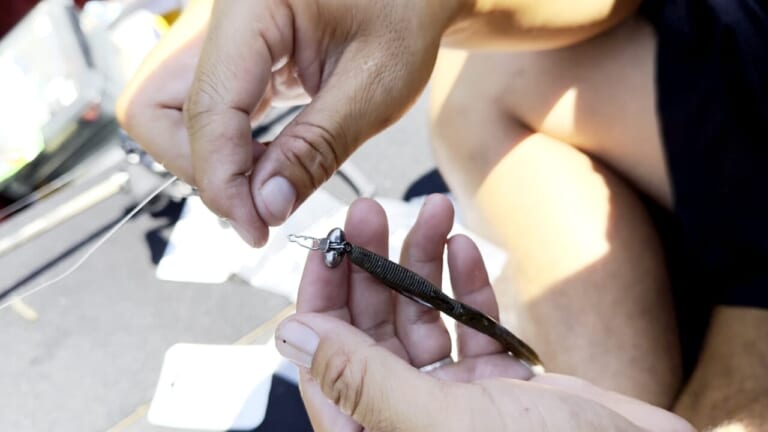 4.ラインを結び、ストッパーを挿入してシンカーをペグ側へスライド、ソフトベイトを装着させれば交換完了です。