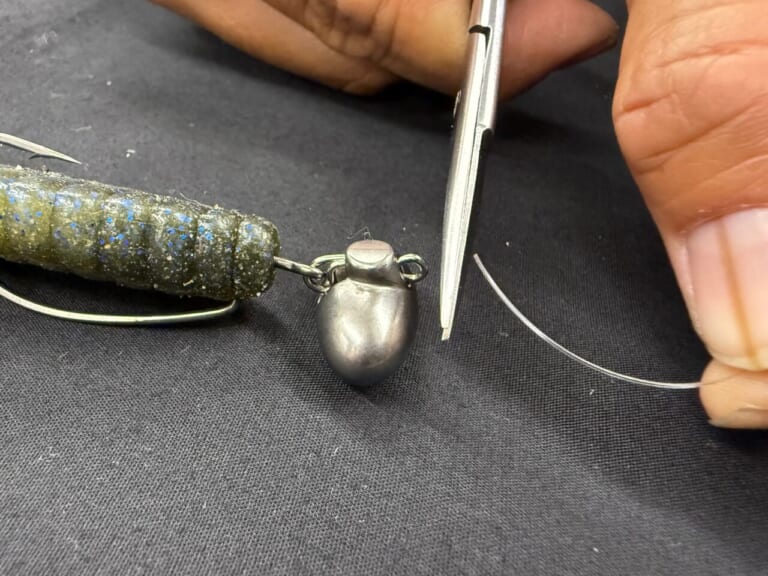 4.ライン結束用スナップにラインを結び、ソフトベイトをフックに装着すれば完成です。