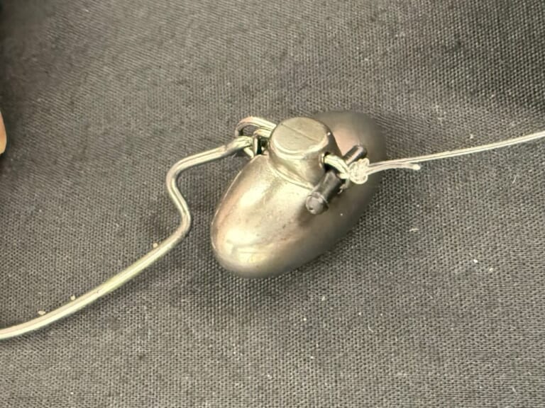 3.ラインを結び、シリコン製ストッパー(または爪楊枝)を挿入し、シンカーをペグ側へスライドさせれば交換完了です。