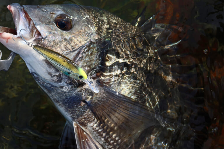 今回はボトムではなく、中層レンジに入っている良型を狙うパターン。シャッド系ルアーやジグヘッドスイミングで連発し、チヌが浮いたタイミングではトップウォーターにスイッチ。