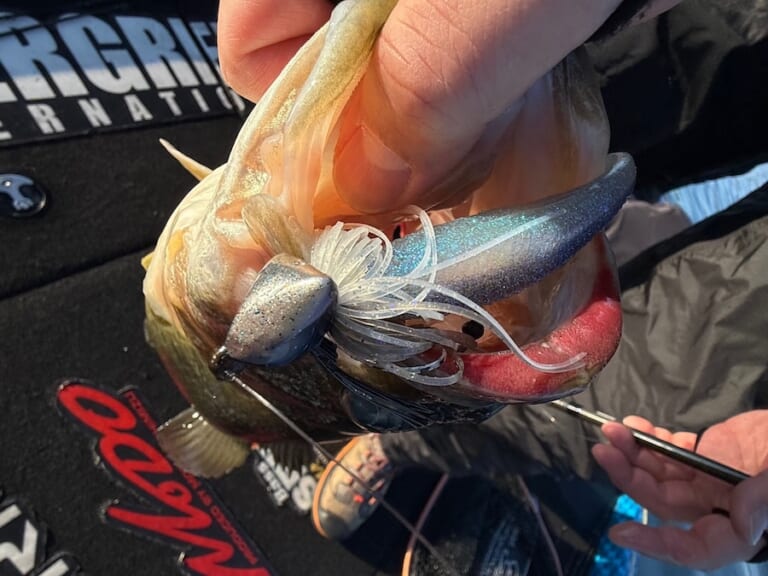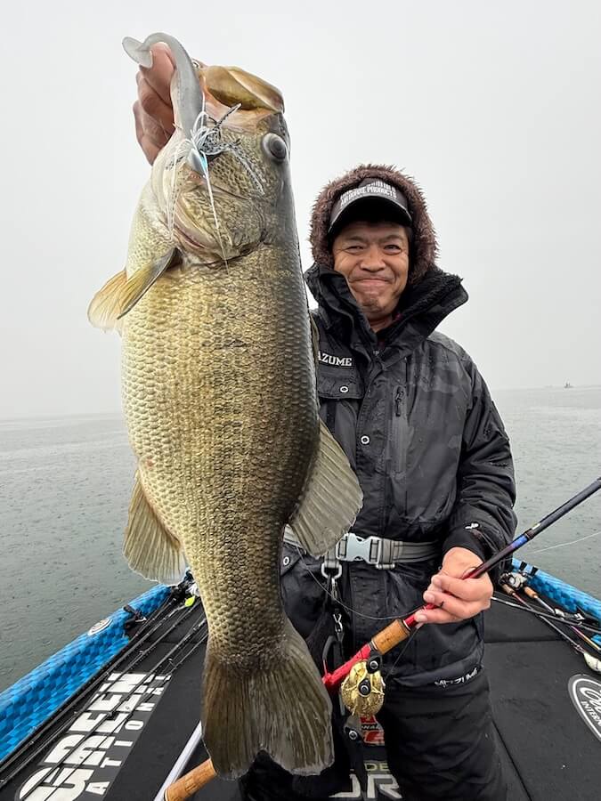 大西健太さんの琵琶湖レポート。いつもなら早春に効くスイミングジグが早くも機能! これは暖冬の影響? グラスリッパーにヘッドシェイカー、そしてヒッチフックは必ずセットしましょう!