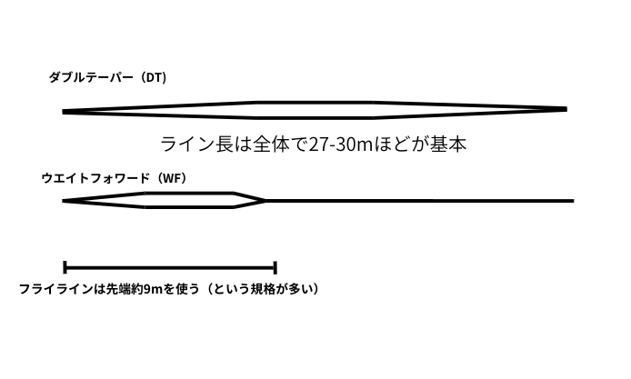 そのテーパーの形状としてWF(ウエイトフォワード)という表記とDT(ダブルテーパー)という表記がフライラインには明記されています。