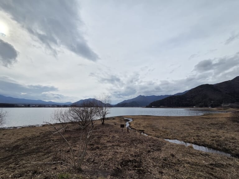 2025年12月19日時点で、1998年以降の観測史上最低水位を記録した、河口湖の大減水。