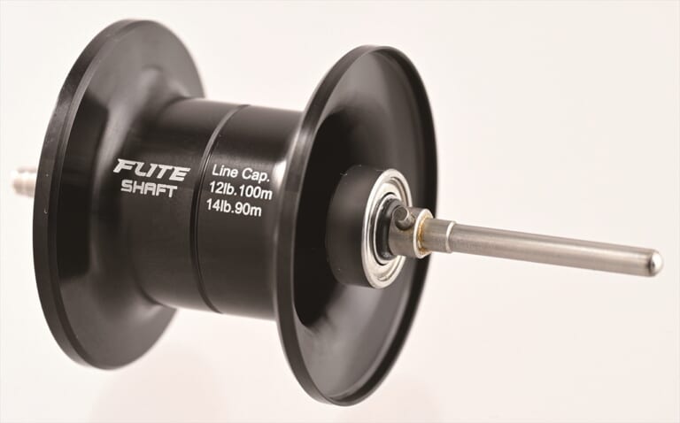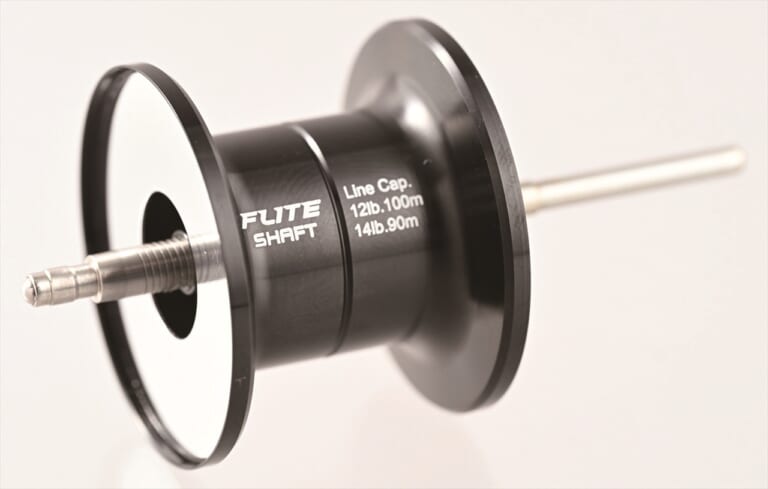 肉厚0.4ミリ、外径Φ33ミリに仕上げた『FLITE SPOOL』はベアリングを含め自重はわずか9.5g。その超軽量スプールが優れた回転性能を発揮する礎となるのが、中空ステンレス鋼シャフト『FLITE SHAFT』だ。両端に圧入された精密SUSボールはサイドプレートと1点で接触。よりスムーズかつ滑らかな回転が、高レスポンスと遠投性能に直結する。