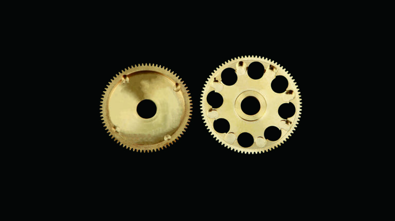 Φ42ミリのオーバーサイズ硬化マシンカット真鍮ギアが力強い巻きに貢献。